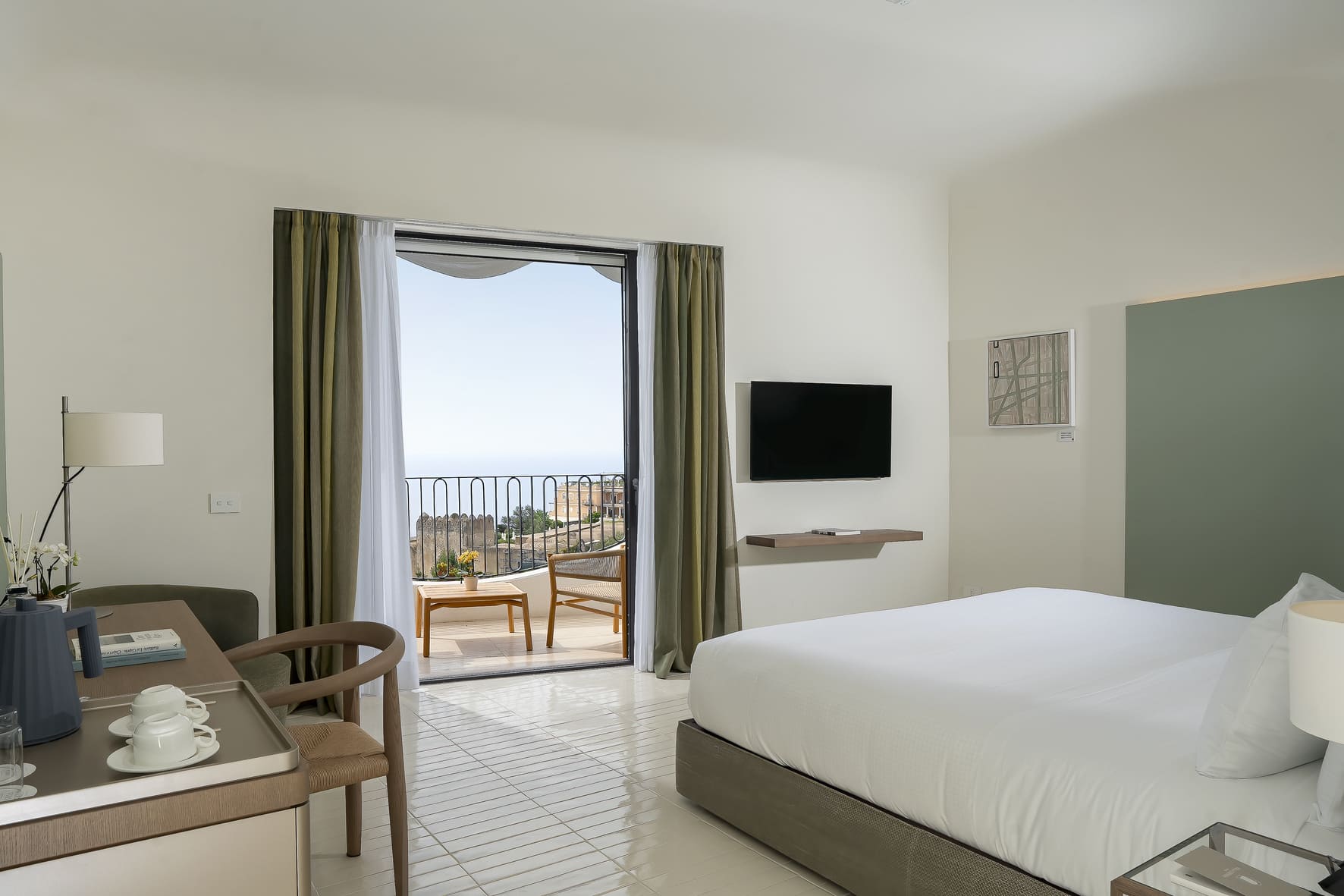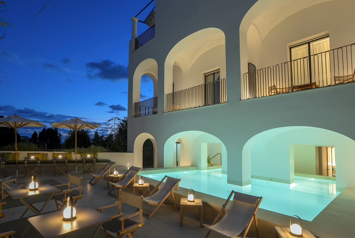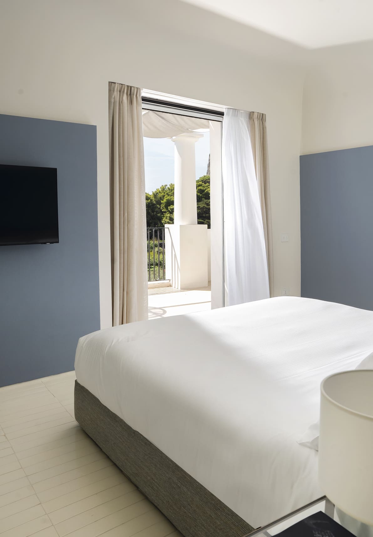 Muri e spazi sono intrisi dalla natura, dall’ambiente e dalla cultura capresi. Le camere e suite con terrazza vista mare si affacciano sul meraviglioso sito archeologico della certosa di San Giacomo. Le tonalità naturali e le finiture eleganti riflettono la bellezza del paesaggio circostante, creando un’atmosfera di armonia e serenità.