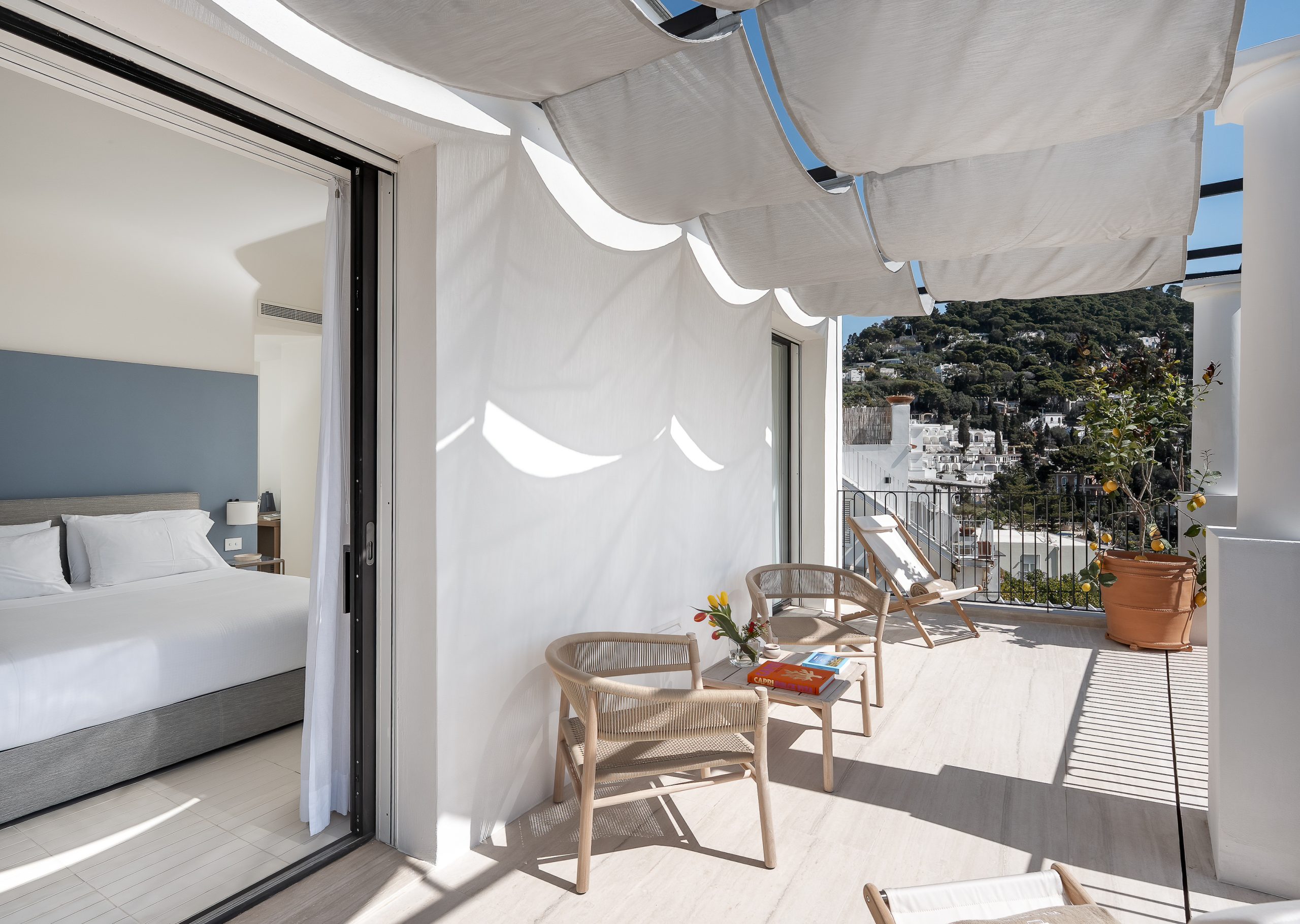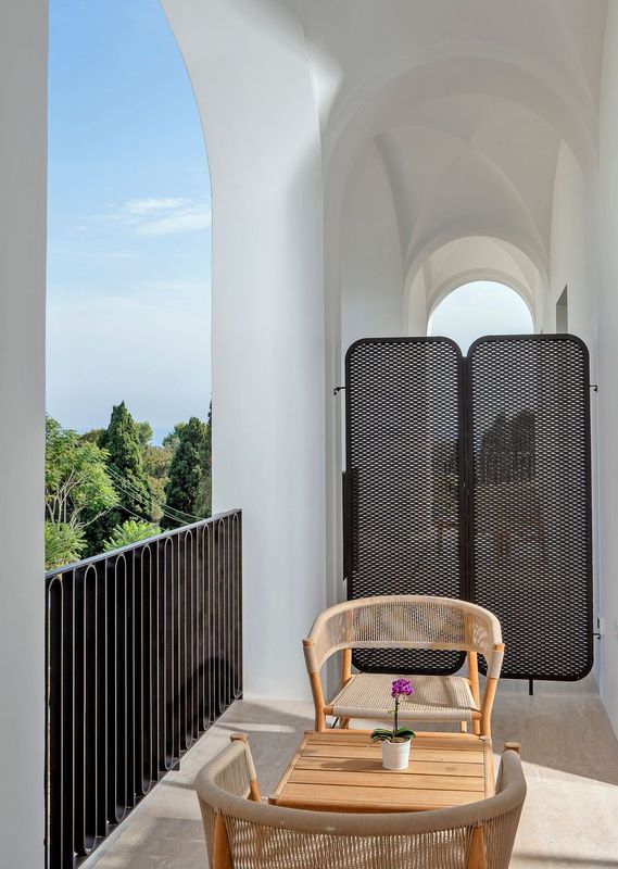 Villa Certosa, with its 14 exclusive rooms and suites, is the perfect home to experience an authentic Mediterranean atmosphere. The walls and spaces are inspired by nature, the environment and the culture of Capri. The rooms and suites with sea view terraces overlook the magnificent archaeological site of the Certosa di San Giacomo. The natural tones and elegant details reflect the beauty of the surrounding landscape, creating an atmosphere of harmony and serenity. In the background, the green of our exfoliating Mediterranean and the breathtaking view of the crystal-clear sea of Marina Piccola, where the famous Faraglioni of Capri stands.
